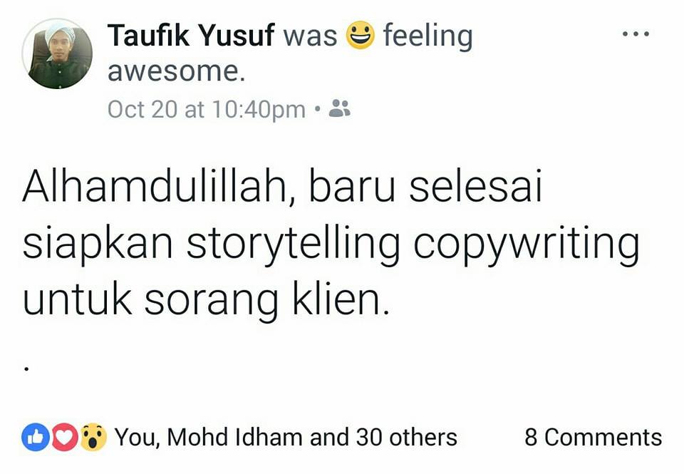 Dari situlah saya mula mengambil servis menulis copywriting, membuat kelas dan menghasilkan ebook berkaitan copywriting dan storytelling.